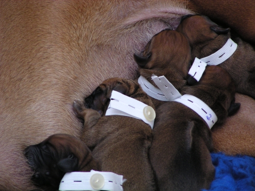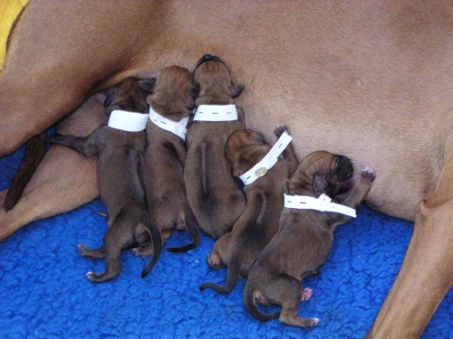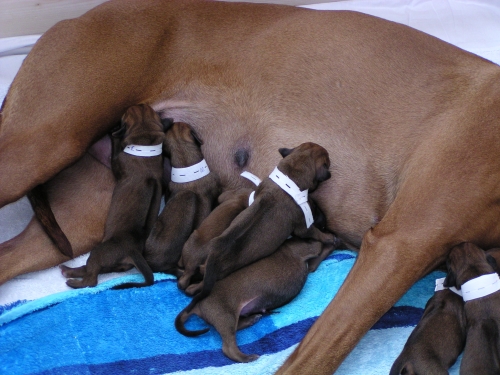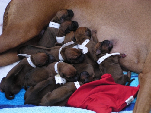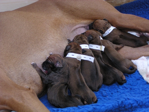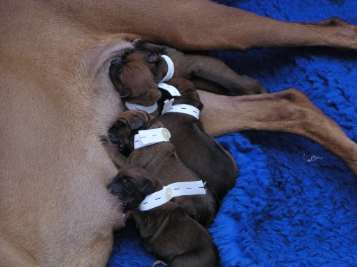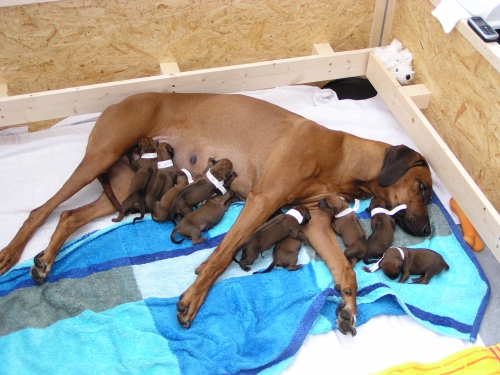 Die Warterei hat nun endlich ein Ende. Shani hat uns ja alle ziemlich auf die Folter gespannt. Heute nacht um 1:35 Uhr ging es los und um 8 Uhr war sie fertig mit der Geburt von 6 Rüden und 4 Hündinnen. Shani und alle Welpen sind wohlauf.